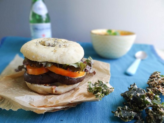 Sunday Morning Banana Pancakes: eggplant tomato bialy sandwich September 10, 2013 by Bill and Merre Davis 0 Sunday Morning Banana Pancakes: eggplant tomato bialy sandwich.