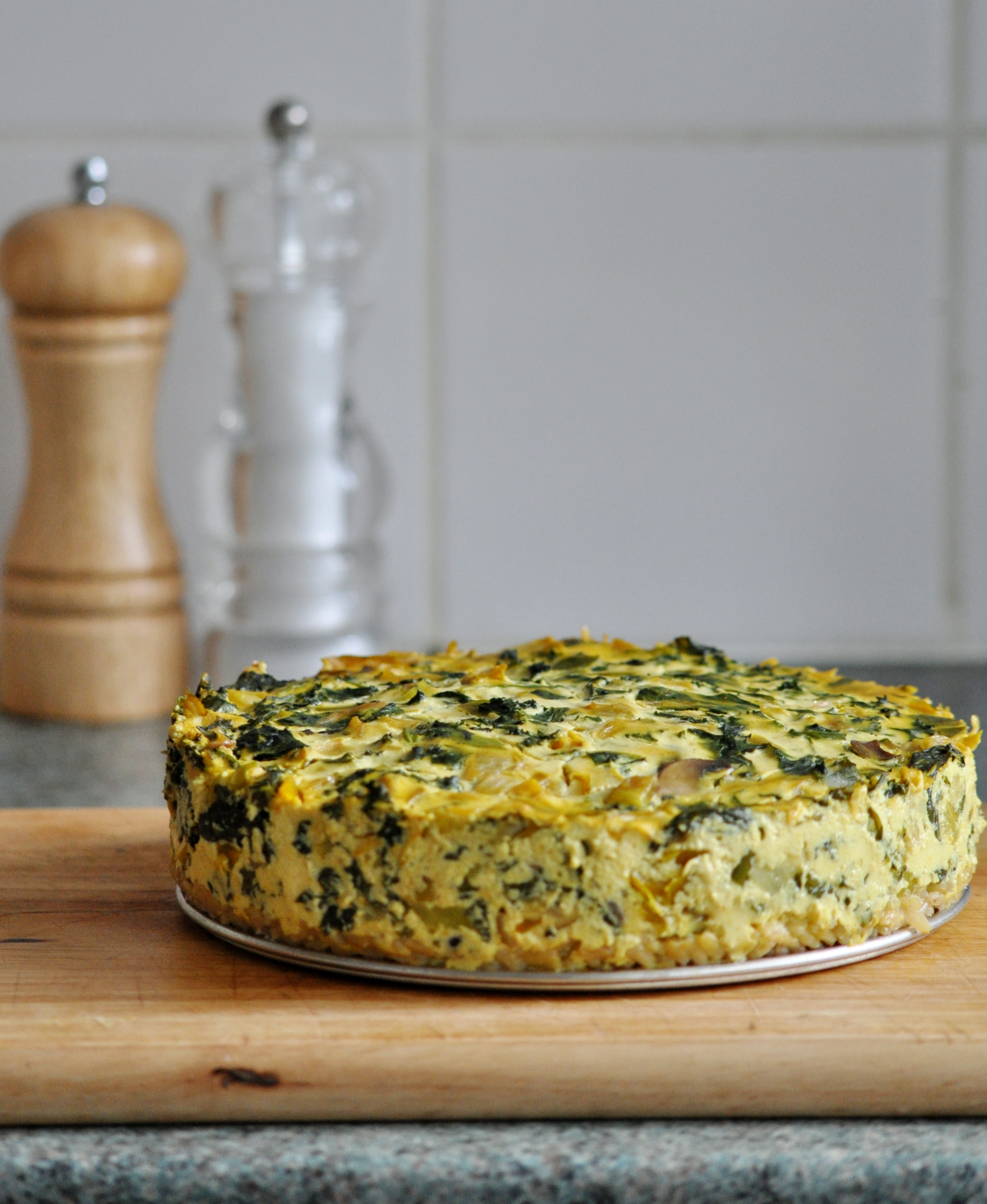 Behold! A vegan masterpiece! No, I am not exaggerating; this beautiful frittata/quiche has been a while in the making and after many attempts I have finally formulated the perfect recipe! The vegetables can be shuffled around a bit, for example – potatoes are really good in this and any green leafy vegetable or member of the squash family would work also. Instead of using normal pastry for a crust, I used brown rice which tastes divine, is way healthier and makes this dish gluten-free if you use tamari instead of soy sauce 🙂