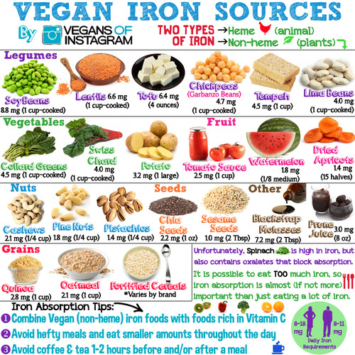 Not fully true, in a vegetarian or vegan diet, iron must be combined with Vitamin C in order to be effective. Yes you can get iron from all of the foods above, but without Vitamin C it will not take effect.