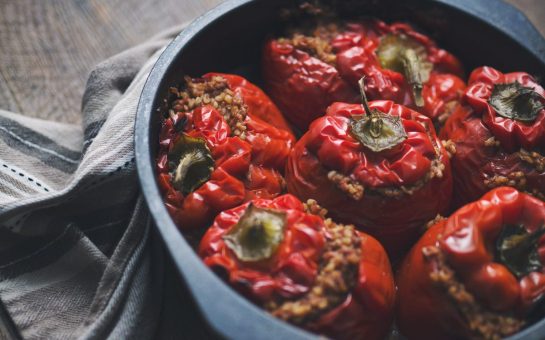 Stuffed peppers are a popular dinner in Eastern European cooking. Typically, they are stuffed with a blend of seasoned minced meat and rice but in this recipe, ground walnuts stand in for meat.