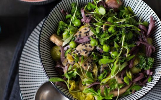 Brussels sprouts and other fresh, green veggies are stir fried with ginger, garlic, and sesame oil, then combined with black rice noodles.