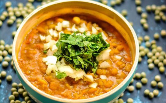 Dried green peas are cooked until soft and then seasoned with spices to create a simple, yet comforting curry that is perfect for serving with flatbread.