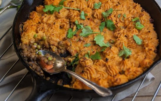 This shepherdess pie is far superior to its male counterpart. The filling for this hearty meal is made from savory lentils, tender peas, and perfectly cooked carrots, then it’s topped with a creamy mixture of mashed sweet potatoes, garlic, and vegan cream cheese.