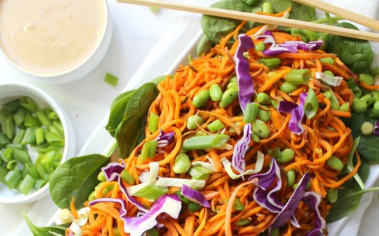 This salad is packed full of savory sweet potato noodles, a tangy peanut dressing, and tender sautéed edamame. It’s great to feed a few friend or to make in big a batch and save for lunches throughout the week.