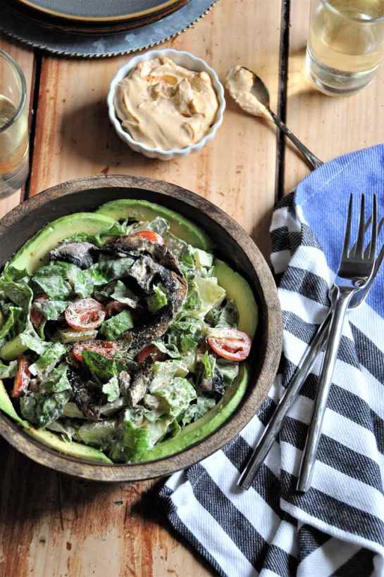 An easy and quick bacon, lettuce, and tomato salad that’s made with Portobello mushroom “bacon” and a delicious smoky and spicy homemade mayo dressing.