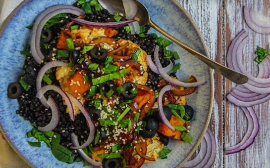 This hearty salad is packed with healthy caramelized vegetables, filling lentils, and an elegant bouquet of herbs and spices. It’s a great meal to make at the beginning of the week so you can have it on hand for lunches or a quick dinner.