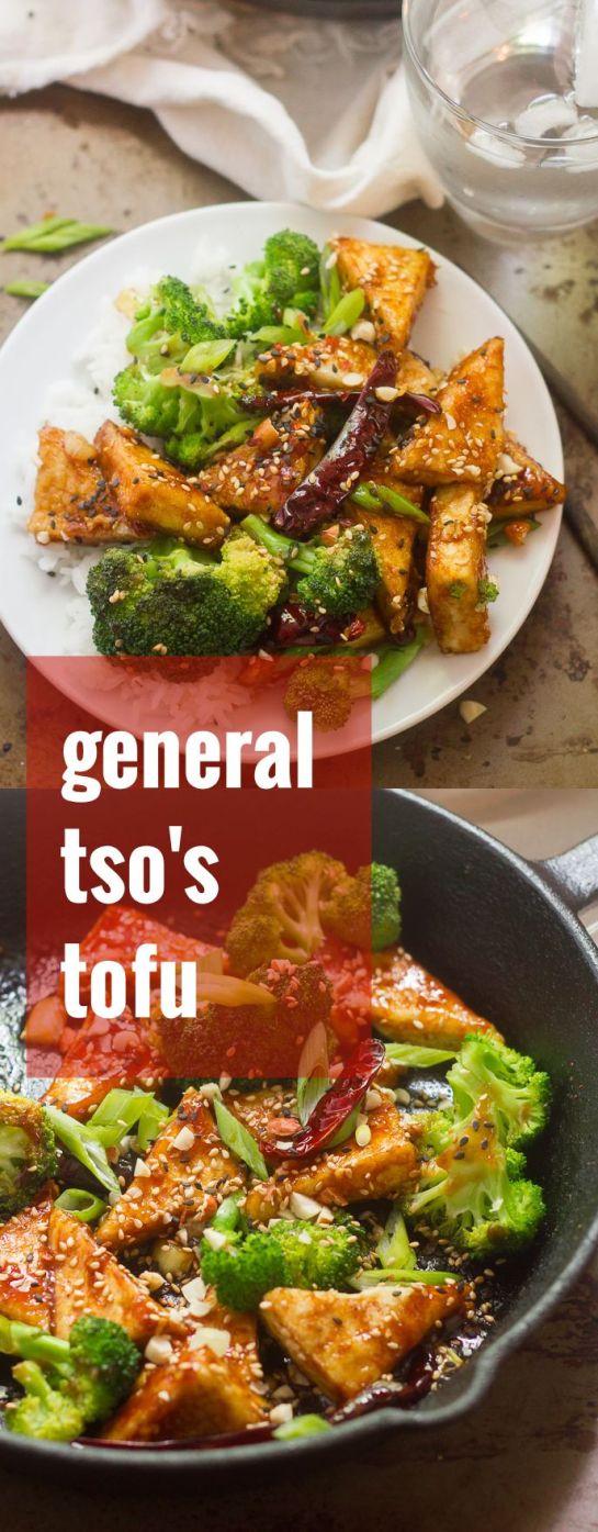 Crispy tofu triangles are drenched in sweet and spicy gingery sauce and served up with broccoli and rice to make this flavor-packed General Tso’s tofu.