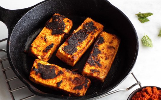 These delectable tofu steaks are bursting with flavor, simple to prepare, and make the perfect addition to almost any dish you care to serve them with. The tofu is marinated in a simple mint, lemon, and black salt dressing and then fried to perfection in a cast iron skillet to give the steaks a crispy outside while the inside remains tender.