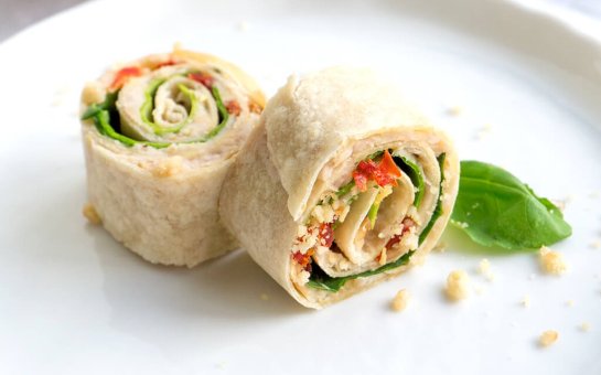These sun-dried tomato, basil, and spinach pinwheels make a perfect party appetizer or light lunch. They take about 15 minutes to make and are a healthy alternative to pinwheels made with cream cheese. They look so fancy when plated as a delicate little roll up. Don’t you think? Sprinkled with a dusting of crushed pine nuts and a basil leaf– you’ve gone gourmet in 15 minutes flat. Impressive.