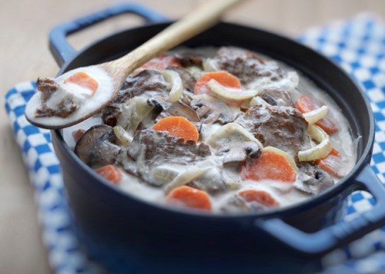 Blanquette is traditionally a ragout made from lamb, veal, or chicken paired with a white cream sauce, but here, seitan takes the staring role. This recipe comes to us from Ôna Maiocco of Super Naturelle and France’s version of Meatless Monday, “Jeudi Veggie” (Veggie Thursday). Serves 4 7 oz. (200 g) gourmet seitan 7 oz. (200 g) mushrooms, washed and sliced 1