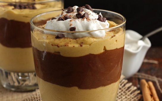 Bold pumpkin pudding is layered with rich chocolate pudding then topped with a dairy-free whipped cream and chocolate chips.