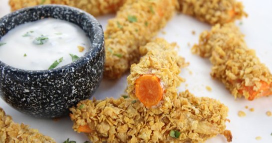 Carrot sticks are coated in a savoury seasoned crispy corn flake crust with a hint of maple syrup sweetness for a kid-friendly addictively scrumptious snack!