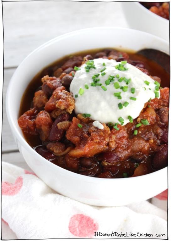So much better than your average vegetarian chili! The secret ingredient takes it to the next level. Easy to prepare and everyone (vegan or not) will love it. #itdoesnttastelikechicken #veganrecipes #chili