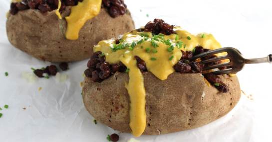 I ❤️ Carbs. I admit, I’m actually not the hugest of potato lovers, (unless you count Crispy Baked French Fries… do fries even count as potatoes?), but even as a not potato crazed person, I’m OBSESSED with this Vegan Loaded Baked Potato. So filling, easy to make, layers of deliciousness… you tried to woo me, potato, and it totally worked. How I was Wooed by a Vegan Loaded Baked Potato: The potatoes have a lightly crisp skin on the outside and are soft and fluffy in the middle. The beans are simmered in my favourite BBQ sauce, making them totally flavour packed. It’s drizzled with