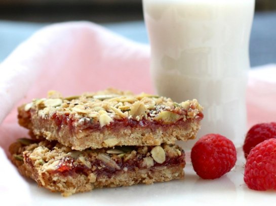 In these delicious raspberry oat bars, the wholegrain spelt flour and old fashioned oats are a get source of fiber. The combination of pumpkin, sunflower, hemp and chia seeds add a nice nutritional punch that you won’t find in traditional desserts.