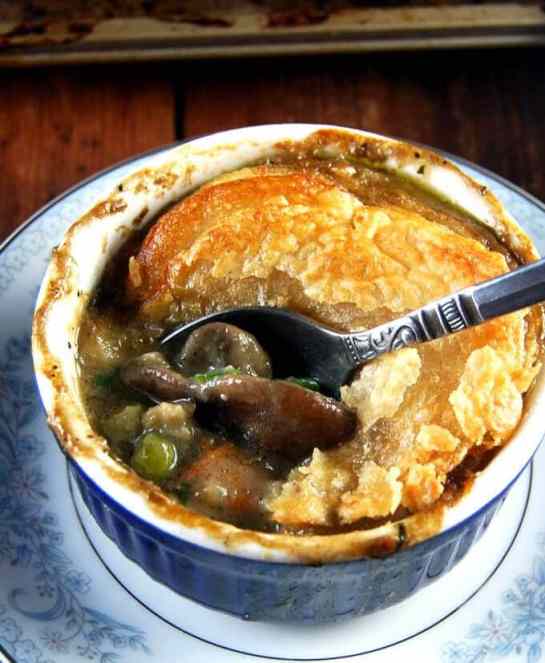 Here’s a dish that would look pretty on any Thanksgiving table and leave your guests licking their forks and spoons: my Vegan Mushroom Pot Pie. And here’s a little secret: that golden, puffy, flaky pastry crust you see atop that bubbling mushroom-pea-carrot filling is 100 percent whole wheat, which will make those guests think you are a freaking genius. Hyperbole aside, these little mushroom pot pies are really cute. I like making individual servings, especially when we have few guests, but you can also bake this up as a single large pot pie. It would look just as good and taste just