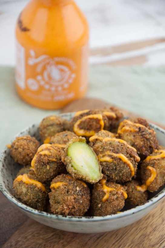 Crispy Fried Brussels Sprouts with Sriracha Mayo. The perfect snack for Brussels Sprouts lovers! Crispy on the outside, melt-in-your-mouth sprouts.