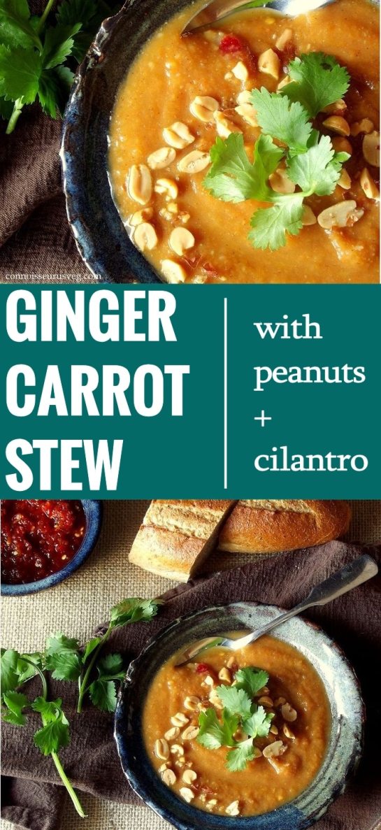 This satisfying and flavor-packed carrot stew is simmered with North African spices, then sprinkled with crunchy peanuts and fresh cilantro before serving. This is a recipe for carrot stew that I’ve been making for years. It’s absolutely delicious, both sweet and spicy, and completely satisfying. In my early days of making this one I often served it when entertaining. My former roommate warned me against this: ‘You can’t just serve people soup! Especially boys! They’re gonna be hungry an hour later!’ Well, this is so not the case with this soup. It is thick and rich and hearty and will