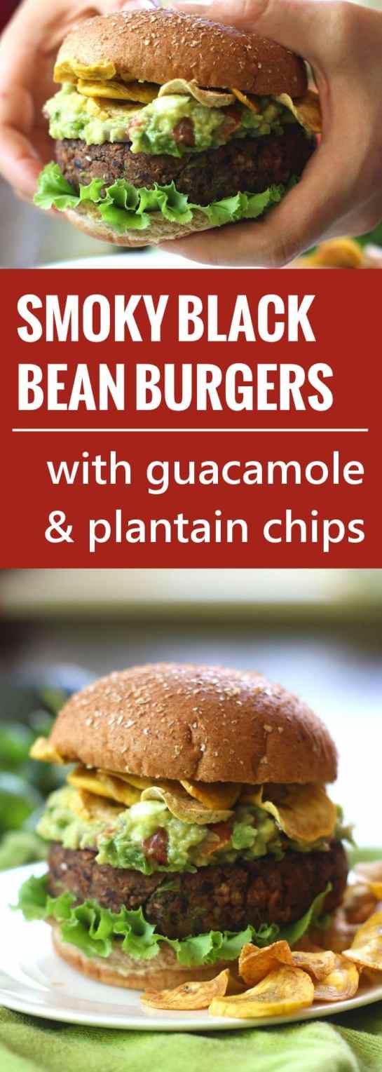 These spicy and smoky black bean burggers are topped with creamy guacamole and crispy plantain chips for an explosion of burger flavors and deliciousness.