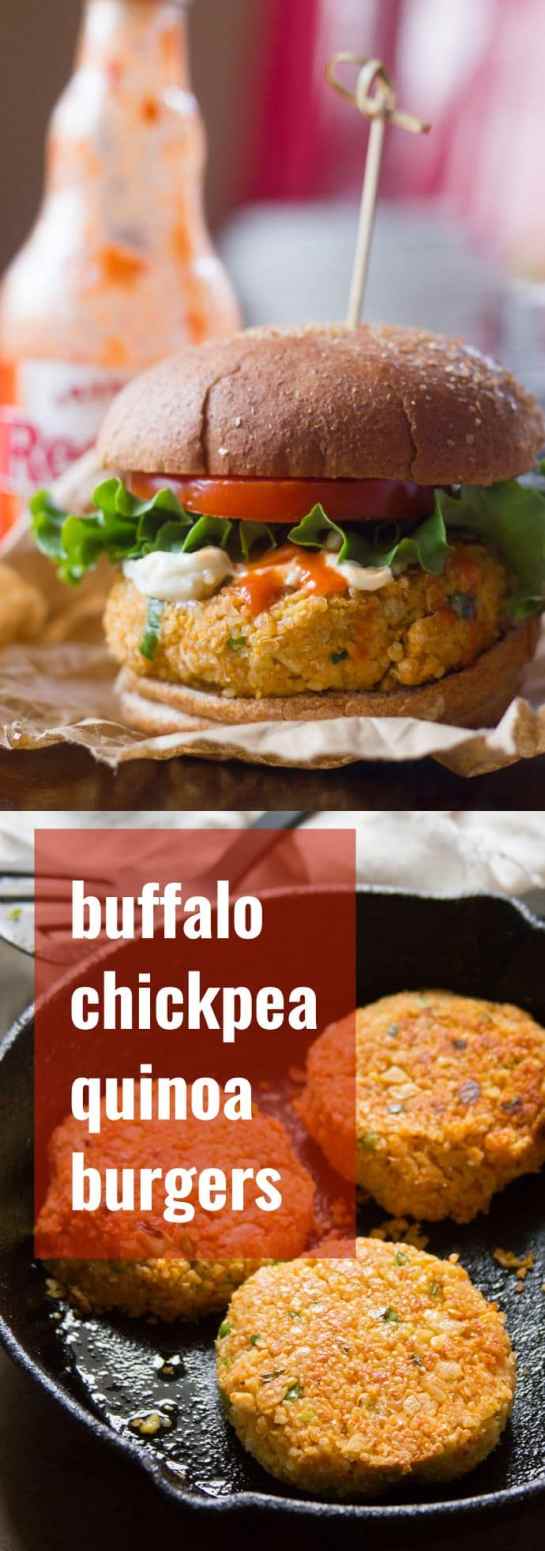 These Buffalo veggie burgers made by blending quinoa and chickpeas with spicy cayenne pepper sauce.