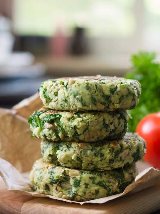 These satisfying vegan kale burgers are made with a flavorful mixture of white beans, crunchy sunflower seeds and lots of garlic.