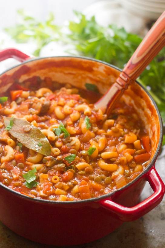 Lentils and mushrooms are simmered up with macaroni pasta and smoky, savory tomato sauce to make this easy and comforting vegan American goulash.