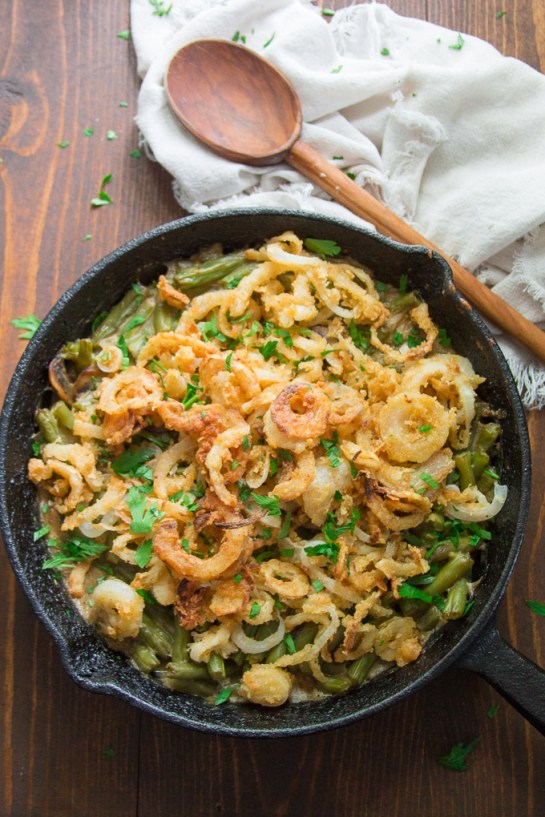 This vegan green bean casserole is bursting with savory mushrooms and green beans in creamy white wine sauce, all topped with homemade crispy fried onions!