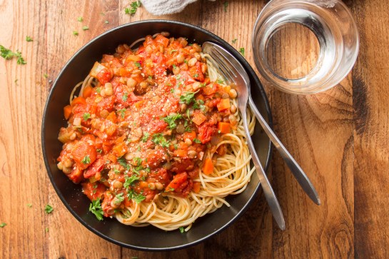 This hearty lentil bolognese is packed with flavor and perfect over pasta. Totally vegan, and easy enough for a weeknight!
