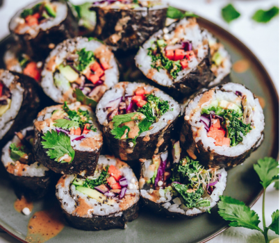 In these rainbow sushi rolls, sushi rice, nori, purple cabbage, carrot, kale, avocado and alfalfa rolled into a tightly packed sushi roll, with a tamari almond butter sauce to dip.