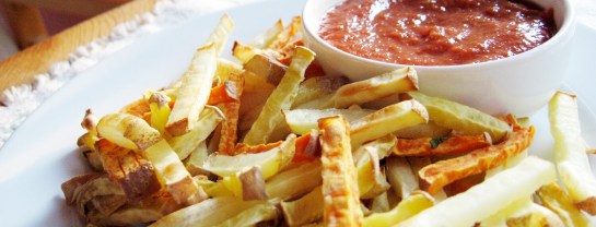Try these baked, oil-free french-fries and ketchup which are a tasty delight! The ketchup can also be used on veggie burgers or
