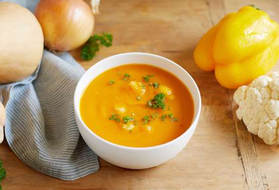 A smooth, full base, tender cauliflower florets, and a hint of caraway create a truly comforting fall butternut squash soup that is 100 percent plant-based.