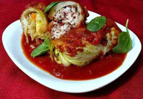 These stuffed cabbage rolls are filled with a flavorful mixture of sauerkraut, wild rice, veggies, and smothered with a layer of marinara sauce. Hands-down, best I’ve ever eaten!