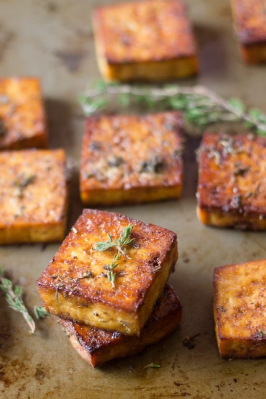 This flavor-packed baked tofu is soaked in a marinade of zesty lemon juice, zippy garlic, and savory herbs, then baked to perfection. (I don’t really see any reason why you can’t eliminate the olive oil if you want..U)