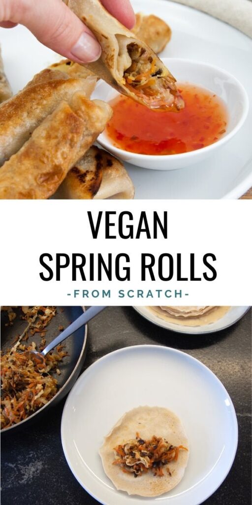 Recipe for Vegan Spring Rolls with homemade wrappers and a delicious filling with Chinese cabbage, soy granule, carrots, onion, and garlic.
