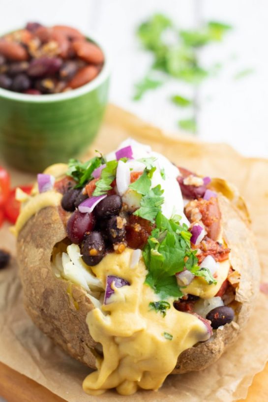 Delicious, healthy Taco Stuffed Baked Potatoes are filled with beans, fresh veggies, cheese sauce, and seasoned with your favorite taco toppings! It’s time for a fiesta with fun with this potato recipe!