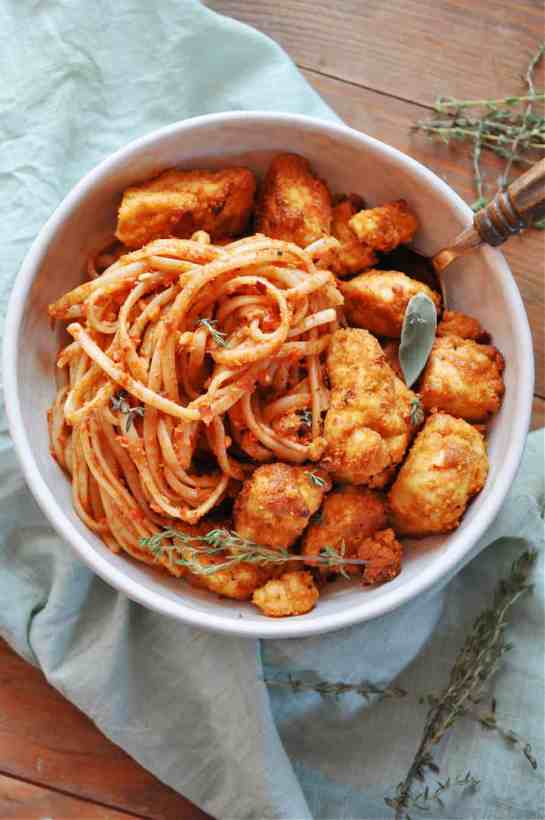 This tahini tofu and pasta will satisfy you! Tofu in a tahini dressing is roasted, served with pasta tossed in a Muhammara-inspired sauce. You can always find subs for the oil. In this \I would use broth or aquafaba.