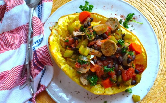 Jambalaya Stuffed Spaghetti Squash [Vegan]