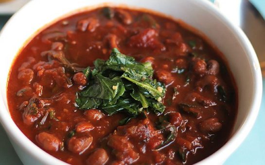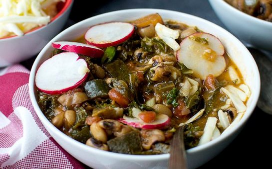 This black-eyed pea chili is slowly simmered over six hours so that the flavors can fully blend together, and then served over sautéed collard greens. It’s delicious, filling, and healthy.