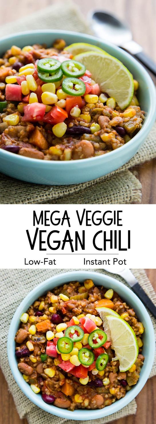 Loaded with veggies and beans, this Mega Veggie Vegan Chili cooks in about 30 minutes in your Instant Pot or on the stove.