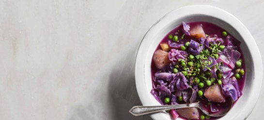 Green peas bring earthy sweetness and dramatic color to this savory purple cabbage soup. Perfect for a cold night!