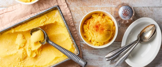 Frozen mangoes and banana make a shockingly creamy frozen dessert.