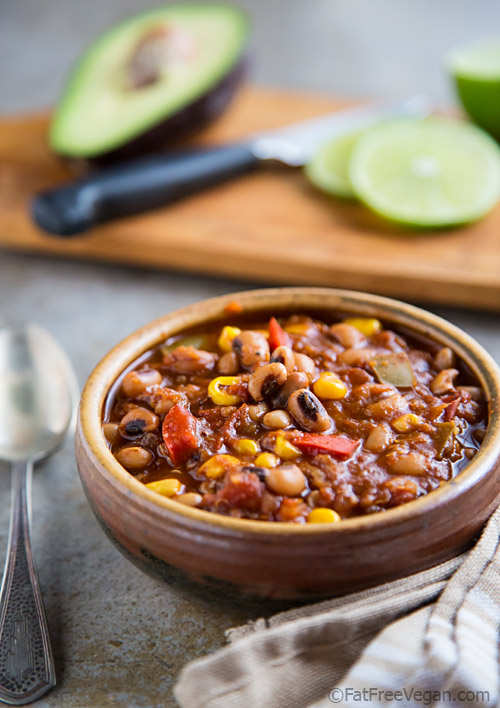 Black-eyed Pea Chili with Quinoa and Corn | recipe from FatFree Vegan Kitchen January 8, 2014 by Bill and Merre Davis 0 Black-eyed Pea Chili with Quinoa and Corn | recipe from FatFree Vegan Kitchen.
