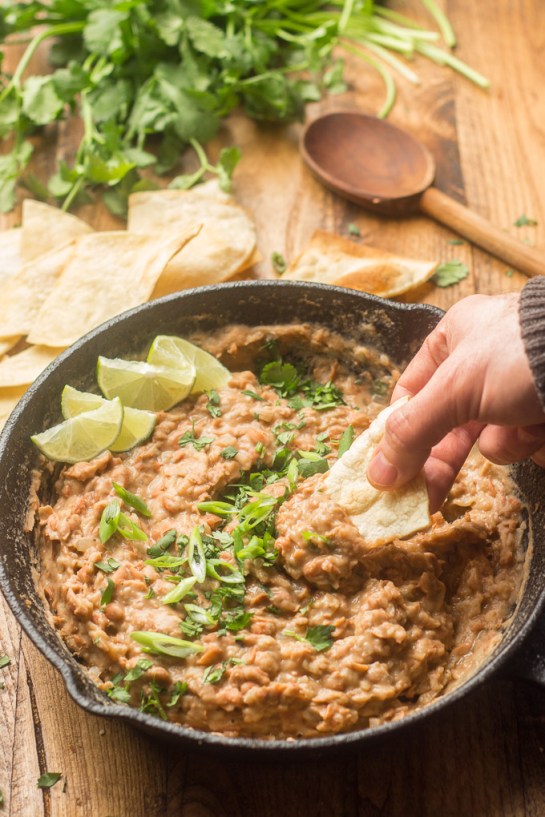 These quick and easy vegan refried beans are perfect for dipping, served as a side dish, or stuffed into burritos. Ready in minutes and full of flavor!