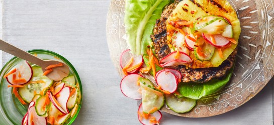 These homemade teriyaki veggie burgers are colorful and fresh, with a bit of heat to contrast the tangy carrot pickle and sweet pineapple. Get the recipe!