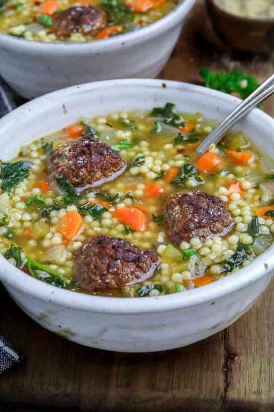 Warm up on a chilly night with a bowl of this Vegan Italian Wedding Soup. It’s brimming with veggies, pasta pearls, and savory vegan meatballs.