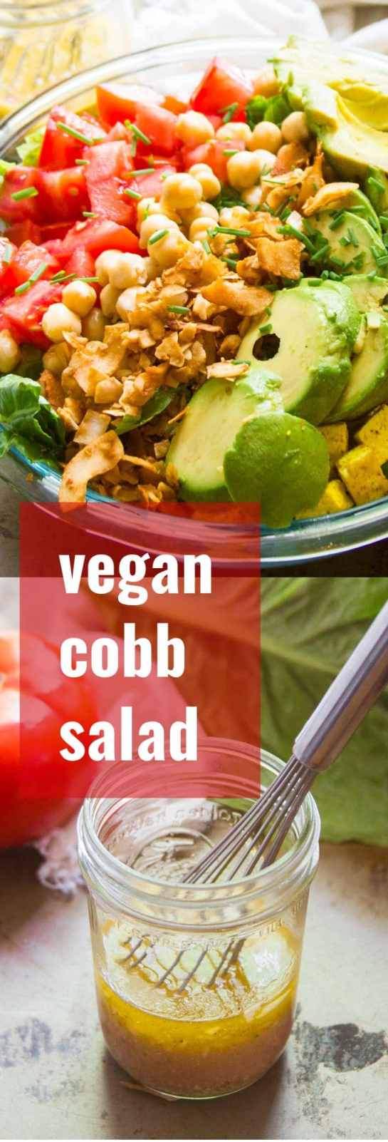Juicy tomatoes, creamy avocado slices, hearty chickpeas, smoky coconut bacon, and savory tofu chunks are arranged atop crispy greens to make this flavor-packed and super satisfying vegan cobb salad.