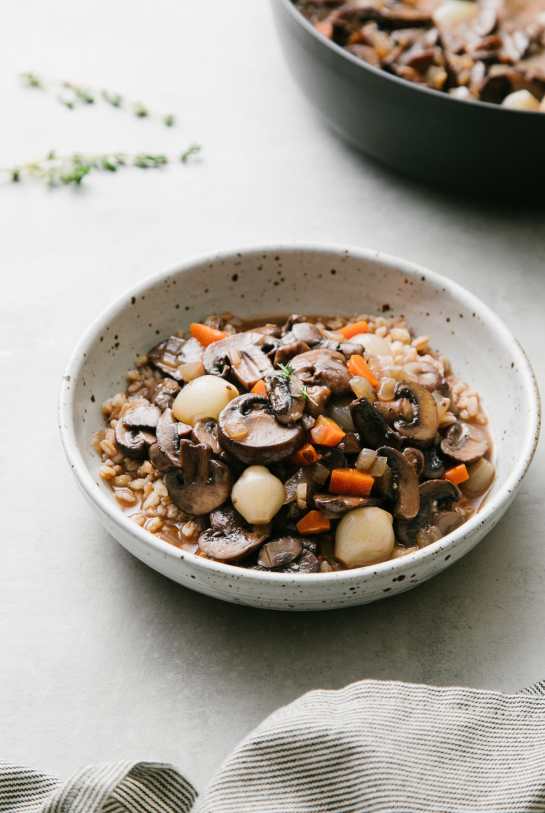 Vegan Mushroom Bourguignon is the ultimate savory mushroom stew that delicious served over mashed potatoes, roasted potatoes, cauliflower mash or farro!