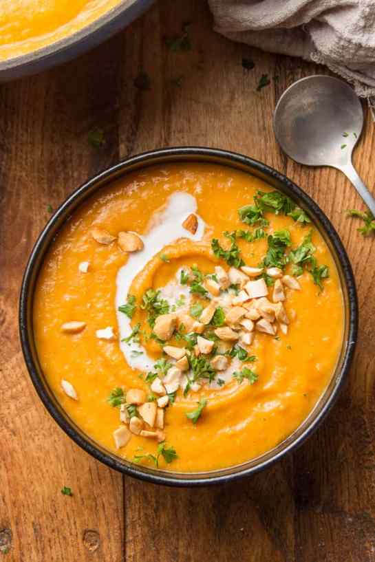 This sweet and savory soup could almost be a dessert soup, as ginger, nutmeg, and cinnamon are spices you find in many